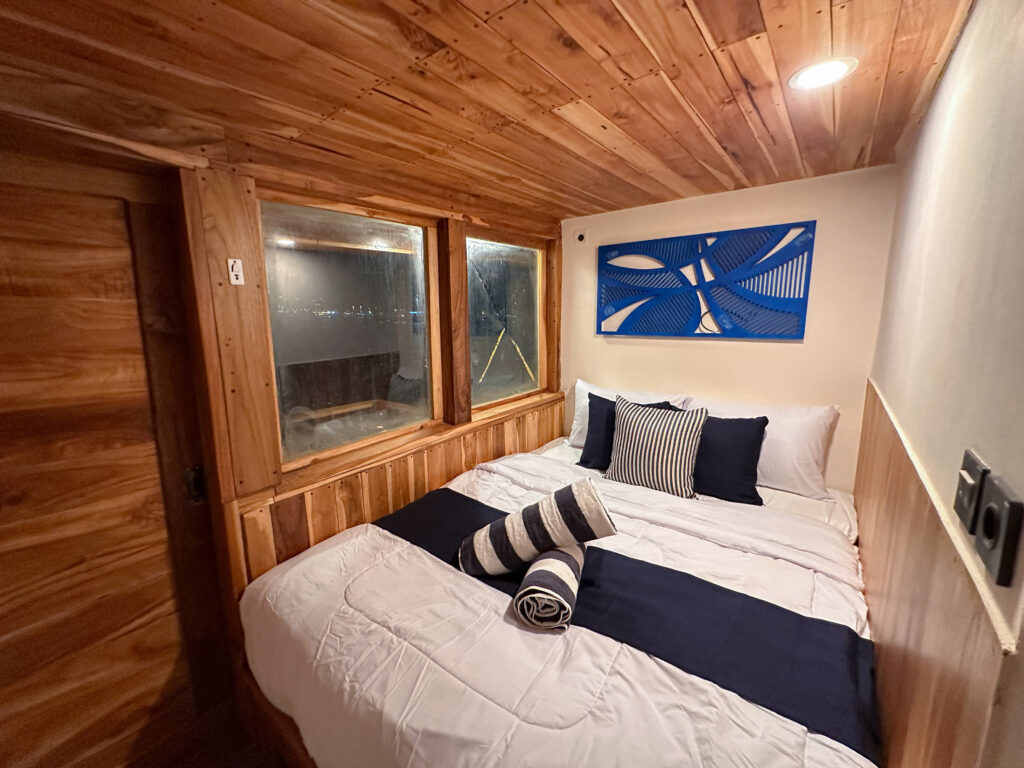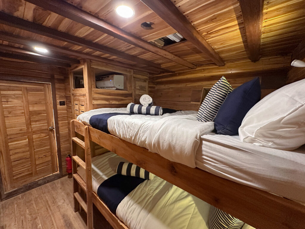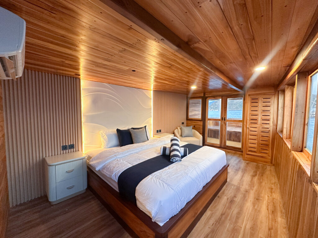The Vhale boat is a Deluxe Plus category phinisi. Has 12 cabins for a total of 28 person.
